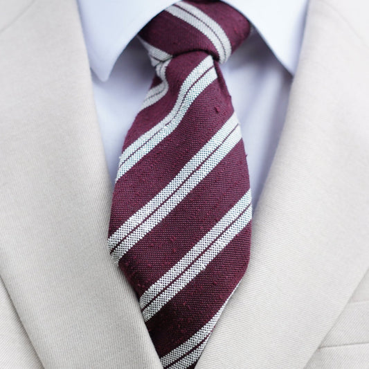 Burgundy & White Three Fold Shantung Silk Handrolled Untipped Tie