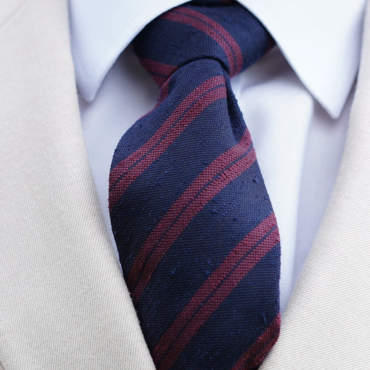 Navy & Burgundy Three Fold Shantung Silk Handrolled Untipped Tie