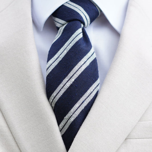 Navy & White Three Fold Shantung Silk Handrolled Untipped Tie
